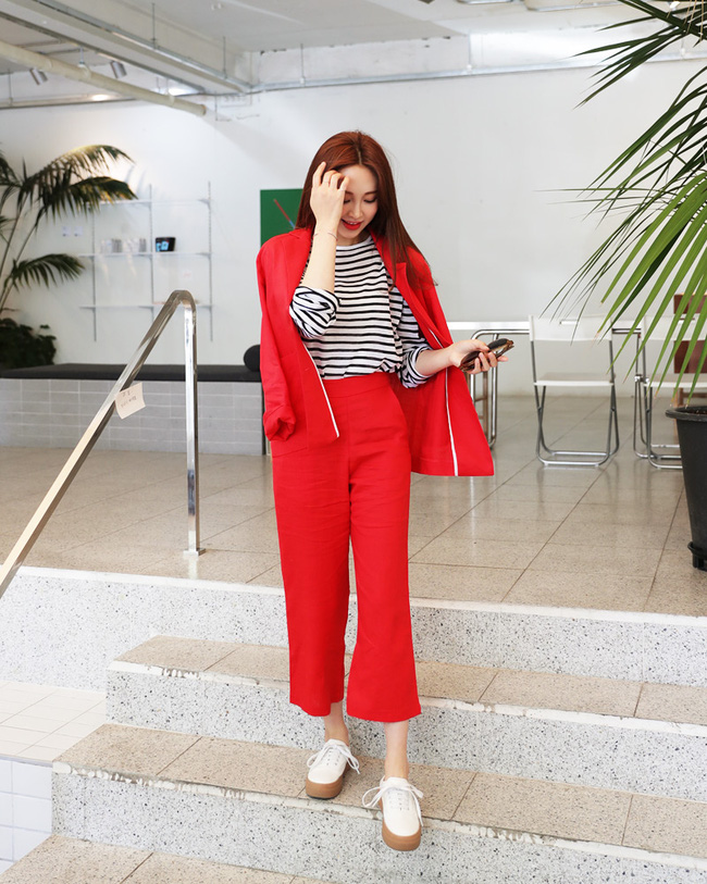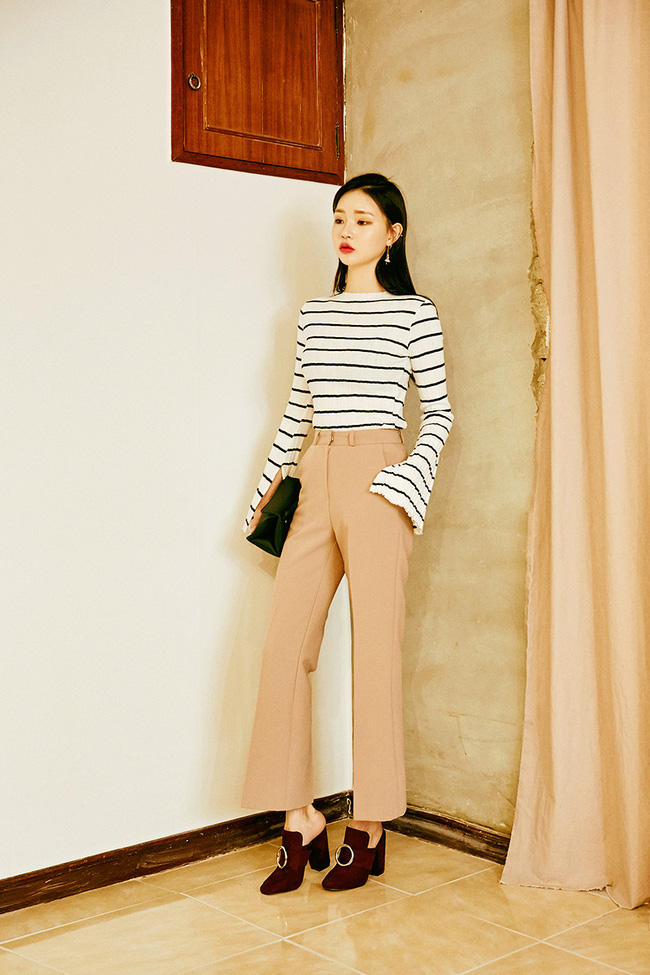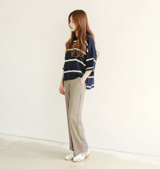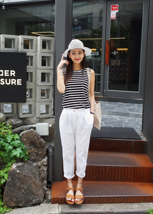 Không chỉ hợp với áo trơn màu mà quần vải còn là bạn đồng hành ăn ý với áo phông kẻ ngang.