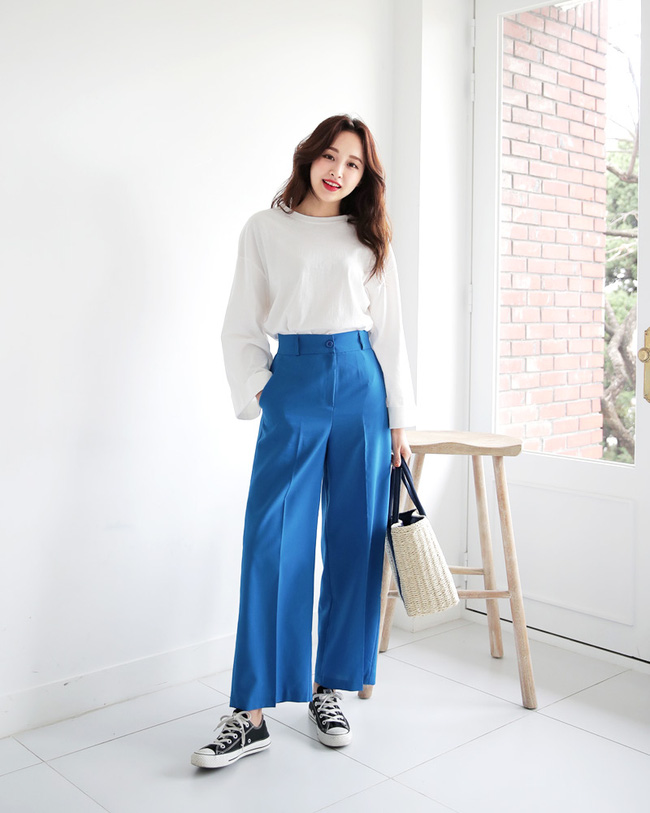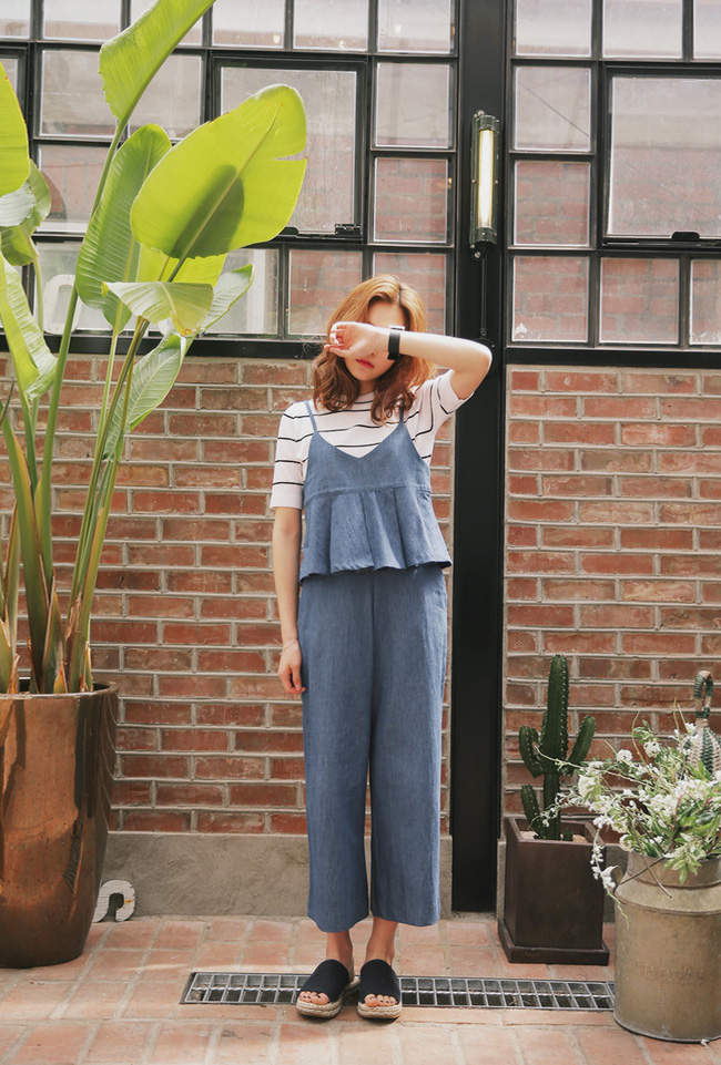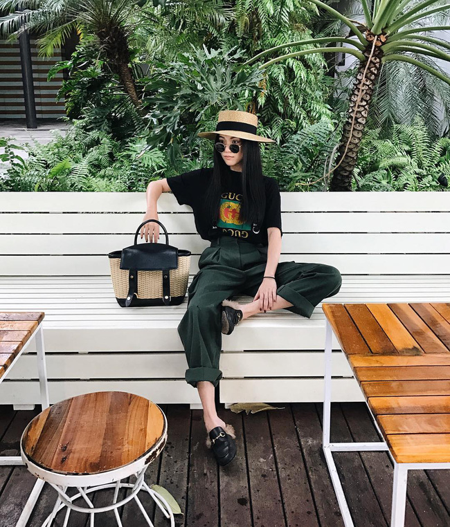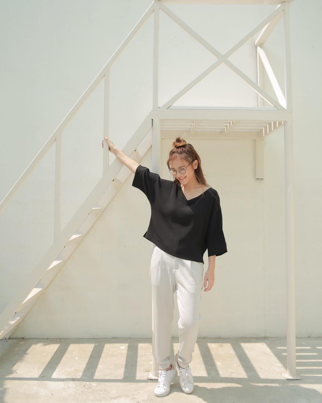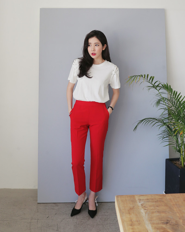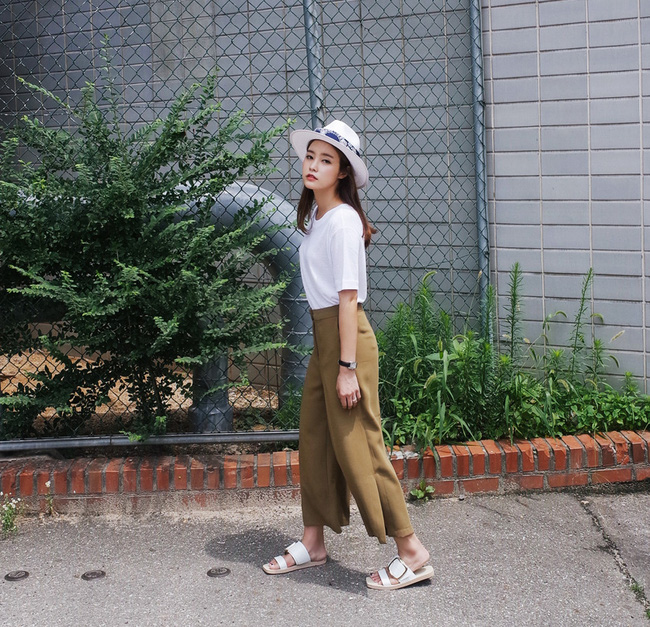 Nếu cho rằng áo phông sẽ làm giảm bớt vẻ nữ tính của bản thân, bạn hãy thử mix cùng áo dây dáng babydoll cùng tone với quần vải nhé.