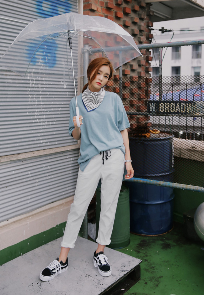 Khi mặc áo phông - quần vải, bạn có thể kết hợp cùng mọi kiểu giày hay sandals bởi đây không phải là set đồ quá kén phụ kiện đi cùng.
