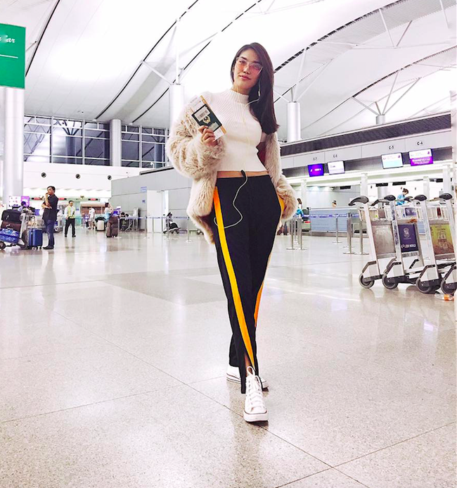 Thời trang sân bay năng động của Lan Khuê với quần xẻ gấu kết hợp cùng áo len croptop, áo khoác lông và giày thể thao tiện dụng.