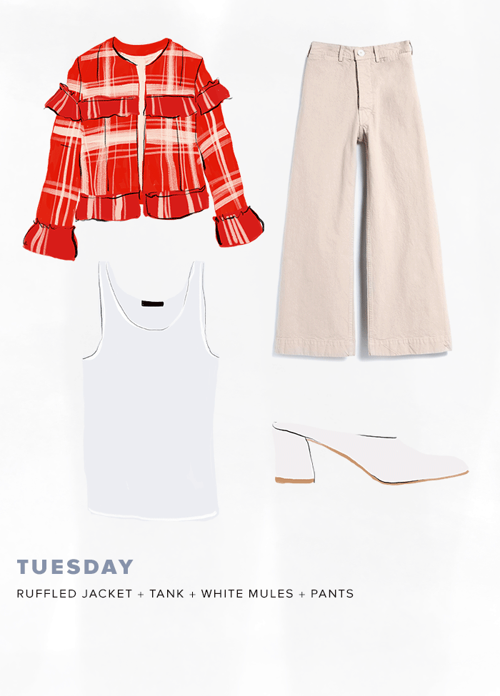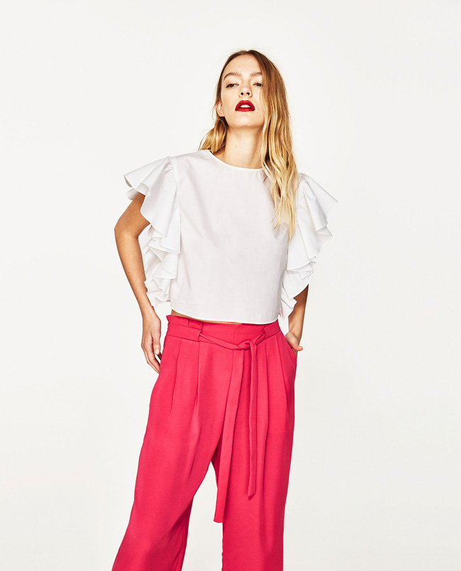 Vẫn là chiếc quần ống rộng quen thuộc ấy nhưng lần này, bạn hãy thử mix cùng một thiết kế áo xếp bèo điệu đà xem sao nhé. Ngày thứ 3 của bạn sẽ rất duyên dáng nữ tính với cặp đôi gọn gàng thanh lịch này đấy. Đừng quên chọn cho mình một đôi cao gót đi cùng để hoàn thiện vẻ ngoài chỉn chu cho ngày thứ 3 đi làm.