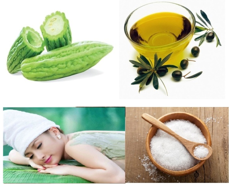 Cách thực hiện: Bạn dùng mướp đắng đã được xay thật nhuyễn cho bát sạch, sau đó thêm 4 thìa muối biển và 3 thìa dầu oliu rồi trộn đều để tạo thành hỗn hợp sền sệt. Các nàng thoa đều lên cơ thể khi tắm, kết hợp mát-xa nhẹ nhàng khoảng 15 phút thì tắm lại.