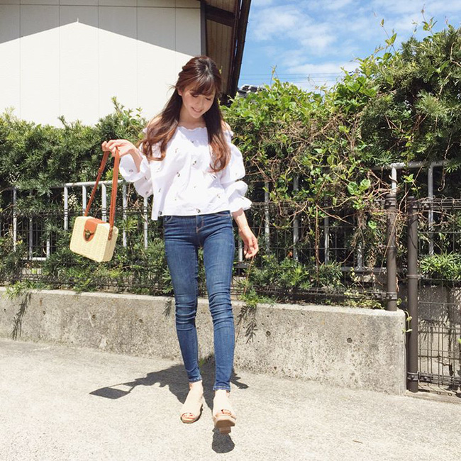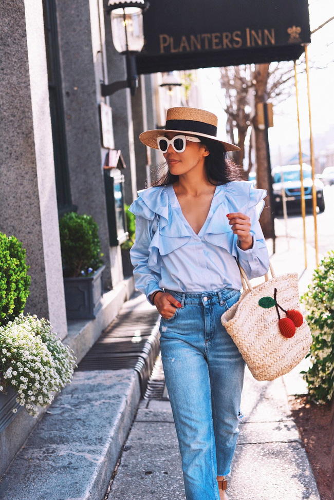 Áo sơ mi vai bèo có vẻ được một số nàng ưa chuộng trong mùa hè năm nay. Bạn có thể mix nó cùng quần momfit jeans, sandals màu da bò đậm cùng kính mắt to bản.