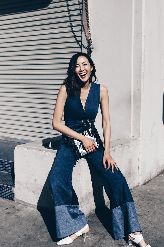 Không hổ danh fashionista nổi tiếng, Chriselle Lim lại xuất hiện sành điệu với cả cây denim đậm màu, giày cut-out đế vuông với clutch tua rua.