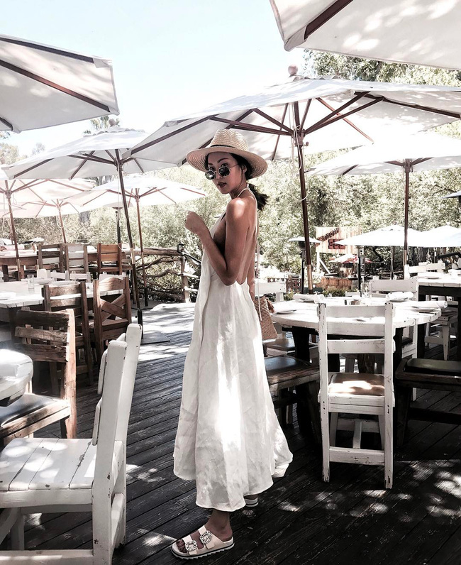 Bên cạnh đó, cô còn diện váy maxi hở lưng, dép lê cách điệu để đi biển đợt vừa rồi.