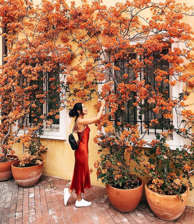 Slipdress màu đỏ khi được kết hợp cùng sneaker trắng, balo vintage của Chanel sẽ không còn giống váy ngủ ở nhà nữa.