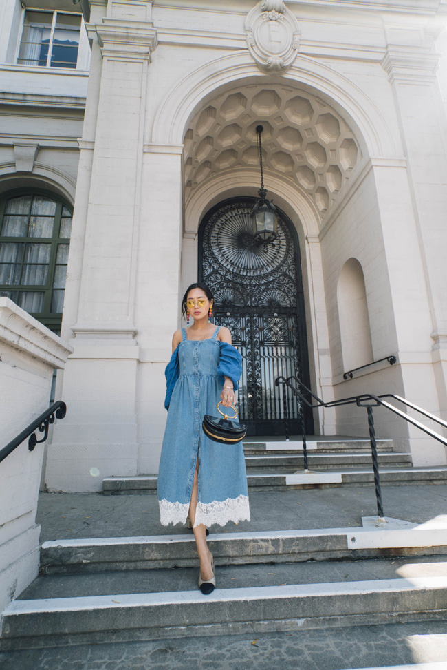 Để khiến chiếc váy denim trễ vai trở nên điệu đà hơn, cô nàng này đã khéo léo kết hợp cùng giày captoe, túi cách điệu của Chloe và khuyên tai to bản.