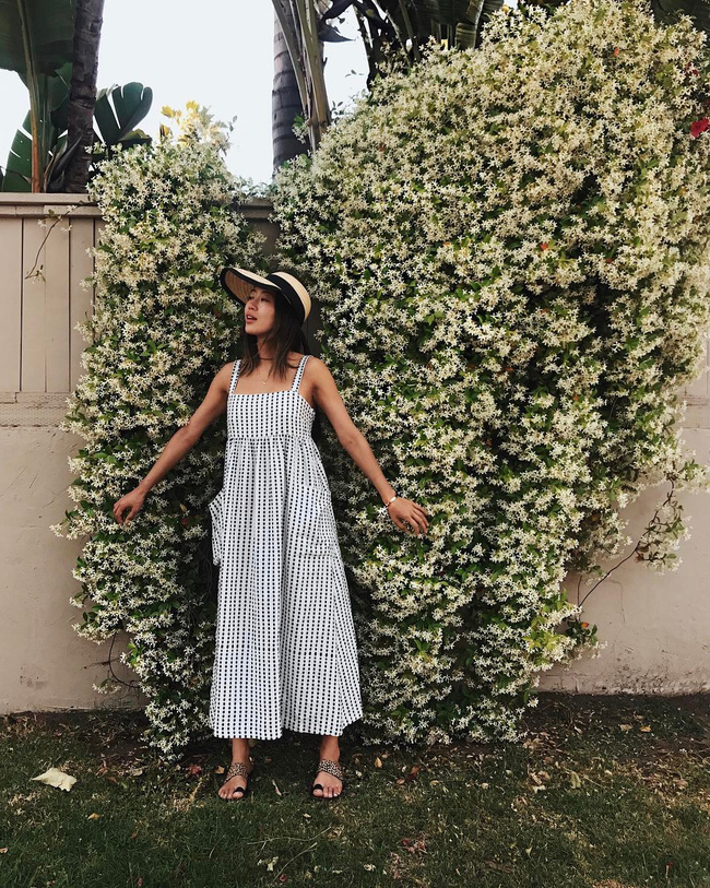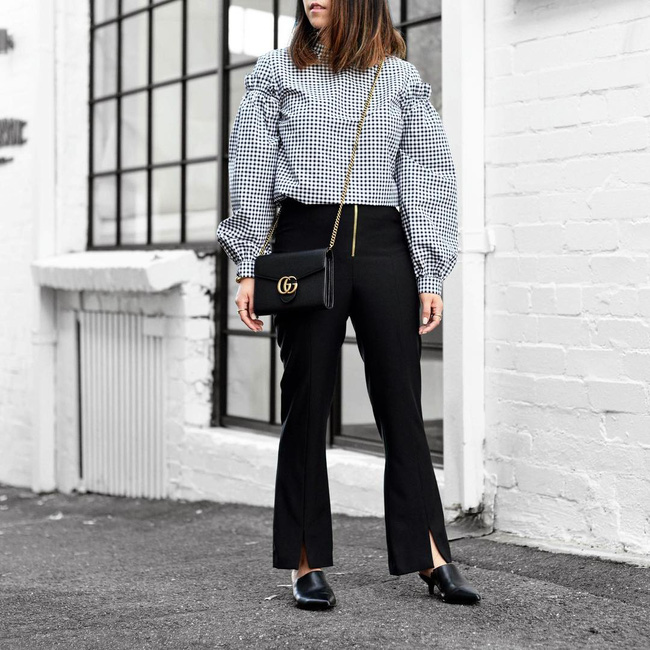 Áo kẻ caro tay bồng quả thực là item rất "khó chơi". Tuy nhiên, nếu bạn biết kết hợp cùng quần vải xẻ gấu, giày mules thì mọi chuyện lại khác.