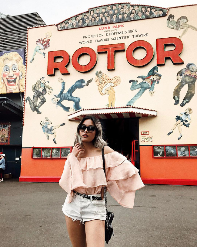 Nếu tự tin về body của mình, bạn hãy thử mặc áo trễ vai xếp tầng màu hồng pastel cùng quần short trắng xem sao.