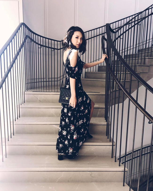 Váy hoa xẻ đùi khiến bà mẹ một con Jenn trở nên đằm thắm vô cùng. Chiếc túi Chanel cùng tone cũng khá ăn nhập với set đồ này của cô.