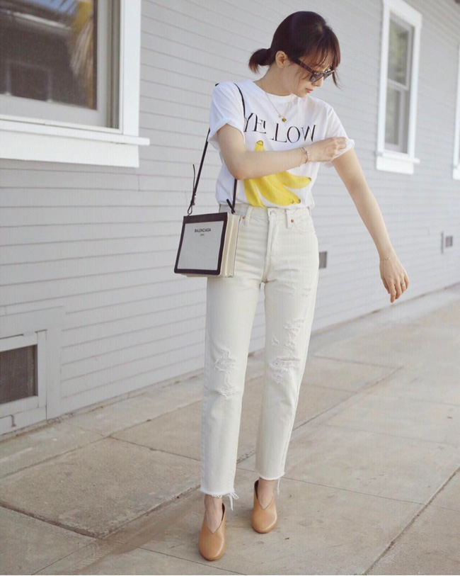 Bắt kịp xu hướng giày V-line đang thịnh hành, Wei Wei lại mix cùng áo phông, quần jeans rách sáng màu cùng túi vuông lạ lẫm.