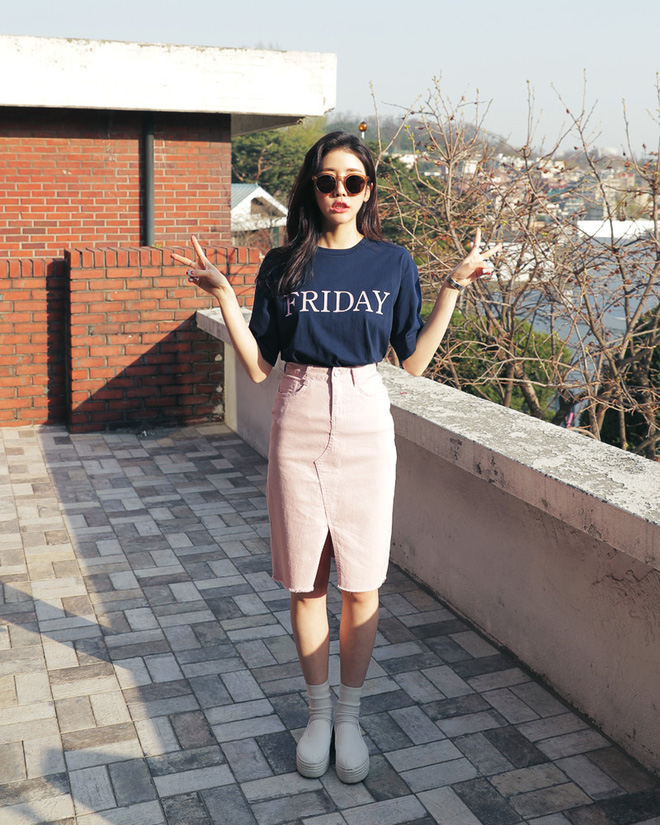 Có thể nói, áo phông và chân váy ôm sát là bộ đôi hoàn hảo giúp bạn thêm phần năng động. Nếu may mắn sở hữu chiều cao lý tưởng, bạn có thể xem xét chọn chân váy midi, dài qua đầu gối hoặc ngang bắp chân. Ngược lại, nếu tự ti về vóc dáng, chân váy ngắn trên đầu gối chính là sự lựa chọn hoàn hảo dành cho bạn.