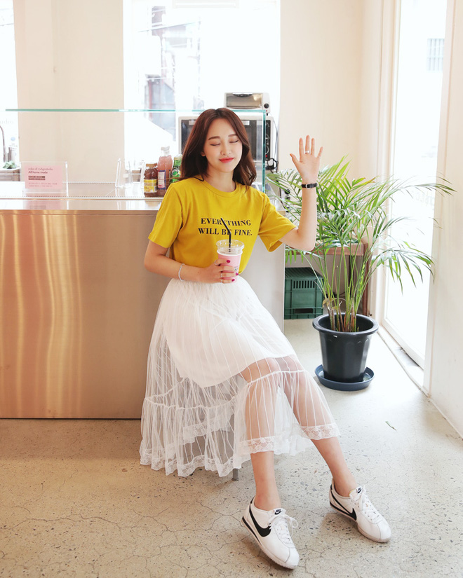Chân váy xuyên thấu, áo phông và giày sneaker nghe thì tưởng không liên quan nhưng khi được kết hợp cùng nhau lại tạo nên hiệu ứng bất ngờ.