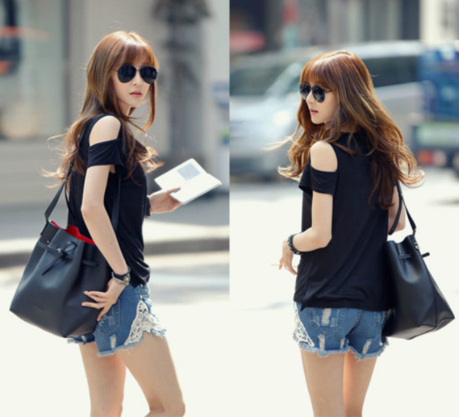 Không kém phần hấp dẫn so với kiểu áo trễ vai, áo khoét vai cũng là kiểu áo khiến chị em lung sục mua cho bằng được mỗi khi hè về. Nếu như chiếc áo trễ vai khoe trọn bờ vai thon gọn, nuột nà, trắng ngần của bạn thì kiểu áo khoét vai lại quyến rũ người đối diện bởi sự nửa kín nửa hở. Mát mẻ, tiện dụng, dễ mix đồ là những ưu điểm dễ nhận thấy ở món đồ này. Bạn có thể thỏa sức sáng tạo khi kết hợp với quần shorts khỏe khoắn, quần jeans cá tính hay cả những chân váy điệu đà.