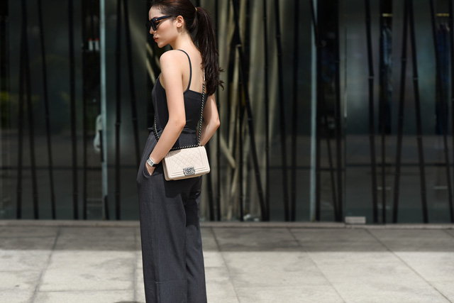 Kỳ Duyên cũng thích sử dụng những món đồ gam màu trơn, mix theo lối tối giản. Cô chọn jumsuit màu ghi phối cùng giầy đính ngọc trai của Gucci và túi xách Chanel boy