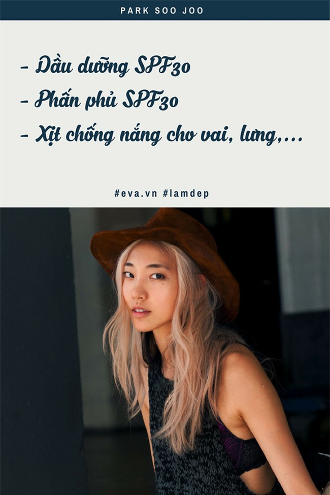 Chân dài hàng đầu xứ củ sâm Park Soo Joo không chỉ dùng một, hai mà tới ba sản phẩm chống nắng khi ra ngoài! Đầu tiên là một loại dầu dưỡng có SPF 30, tiếp đến là một loại phấn phủ cũng với SPF 30 để tránh da bị đổ mồ hôi tới bóng nhẫy. Nếu phải vận động nhiều như là đi bơi chẳng hạn, người đẹp tóc bạch kim sẽ dùng thêm một sản phẩm chống nắng nữa dạng xịt có chỉ số SPF50 trên vùng trán, vai và lưng. Cô học được những phương pháp chống nắng cầu kỳ này từ chính người mẹ của mình.