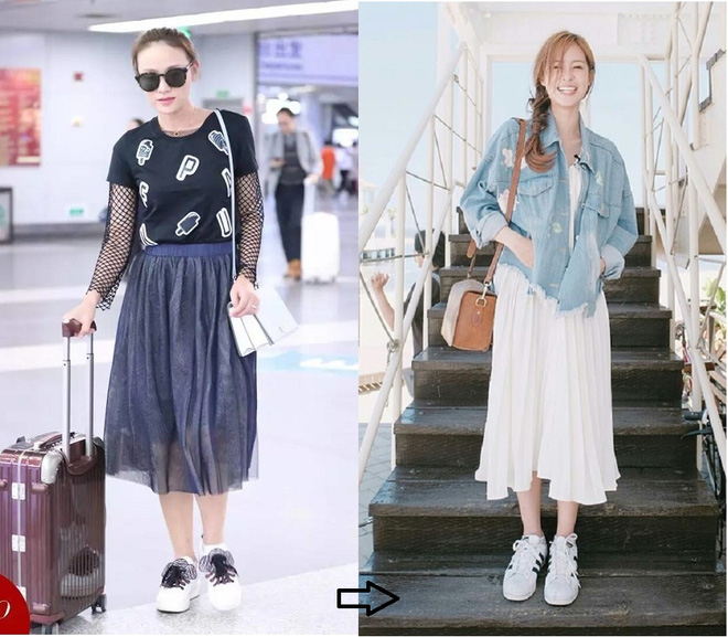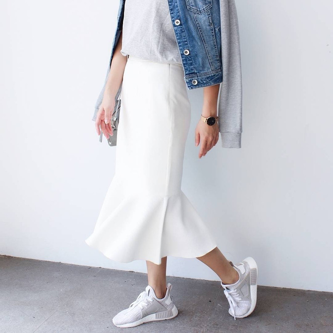 Váy hay chân váy dáng dài đi cùng với các loại giày thể thao là một combo vừa cá tính lại điệu đà được rất nhiều cô nàng yêu thích thời gian gần đây. Tuy nhiên, cũng giống như giày cao gót, loại giày thể thao được lựa chọn cũng không nên có phần đế quá dày, thiết kế cũng cần mảnh mai, đơn giản, ôm sát chân để không khiến phần chân bạn bị ảo giác trông béo hơn.