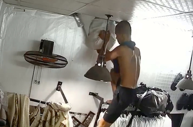 Sau khi lọt được vào tiệm quần áo, tên trộm phát hiện bên trong có camera an ninh, và nhảy lên xoay camera hướng khác nhằm tránh mặt.