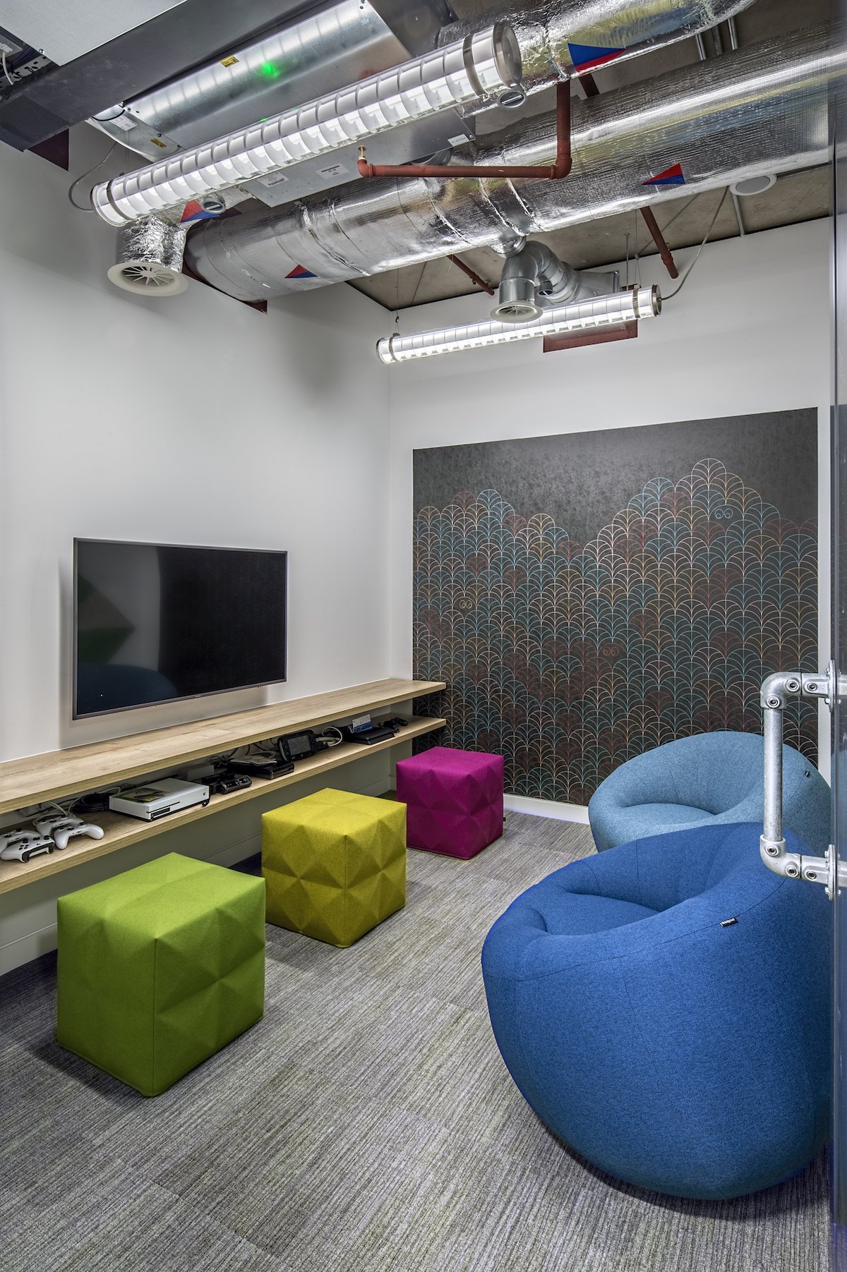 Một số phần tường của công ty không được sơn để giữ vẻ hiện đại.