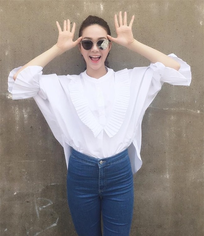 Sơ mi trắng tay loe cũng được hai mỹ nhân đình đám Vbiz Minh Hằng - Đông Nhi trưng diện mix cùng quần jeans trẻ trung năng động.