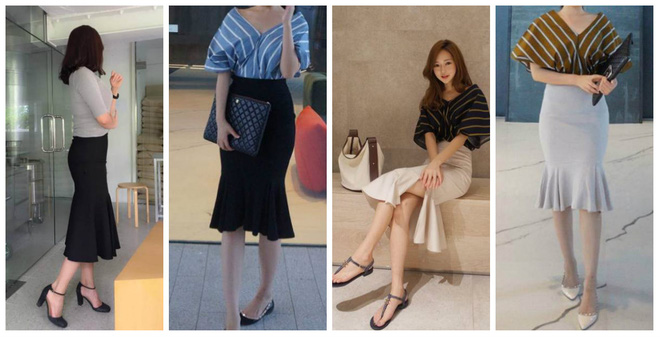Năm nay, khi những chi tiết cách điệu lên ngôi thì thiết kế chân váy đuôi cá cũng không nằm ngoài xu hướng tự làm mới mình. Nếu như thông thường chi tiết đuôi cá xếp ly xòe nhẹ ở gấu váy, thì nay cách điệu hơn chút bạn sẽ thấy sự bất đối xứng khá hay ho tại chính chi tiết này. Xếp tầng, vạt chéo hay thêm thắt chi tiết xẻ cao... đó là những cách điệu mà nàng công sở không thể làm ngơ.