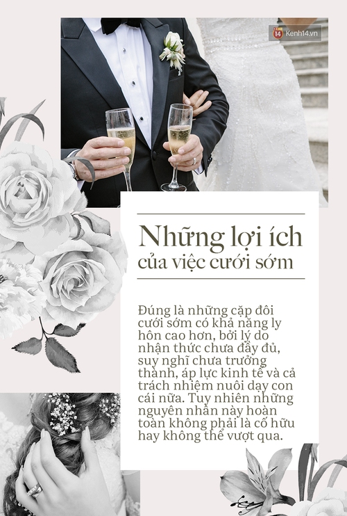 Nói tóm lại, đúng là những cặp đôi cưới sớm có khả năng ly hôn cao hơn, bởi lý do nhận thức chưa đầy đủ, suy nghĩ chưa trưởng thành, áp lực kinh tế và trách nhiệm nuôi dạy con cái. Tuy nhiên những nguyên nhân này không phải là cố hữu hay không thể vượt qua. Bạn hoàn toàn có thể cưới sớm mà vẫn lên kế hoạch đầy đủ, bạn có thể không có em bé ngay và những vấn đề kinh tế cũng hoàn toàn có thể giải quyết dần dần, dù rằng bạn sẽ mất một vài năm tích góp, tiết kiệm.