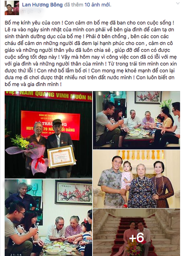 "Vậy mà hôm nay vì công việc con đã có lỗi với mẹ với gia đình và những người thân của mình! Từ trong trái tim mình con xin được thứ lỗi! Con nhớ bố lắm bố ơi! Con mong mẹ khoẻ mạnh để con lại đưa mẹ đi chơi được thật nhiều nơi trên đất nước mình ! Con luôn biết ơn bố mẹ và gia đình mình!" - nghệ sĩ Lan Hương đăng tải dòng chia sẻ đầy xúc động.