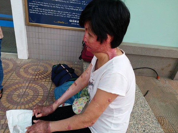 Khuôn mặt chị Trang biến dạng sau khi bị chồng tẩm xăng đốt.