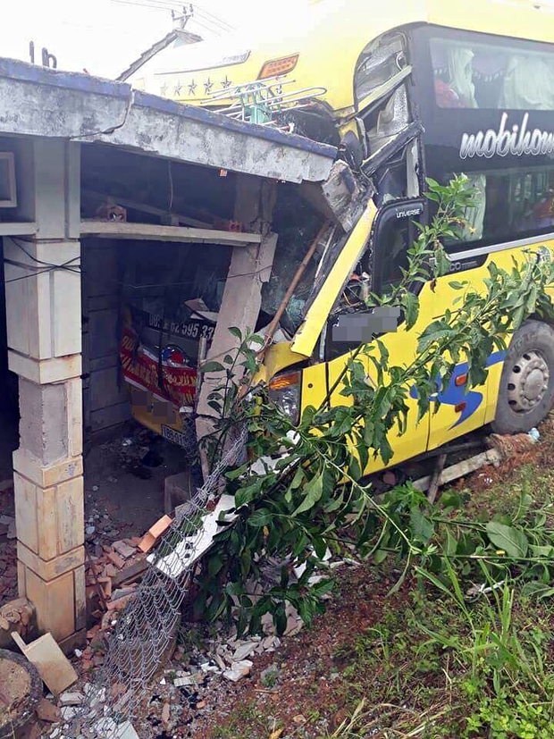 Tại hiện trường, ô tô khách đã đâm sập một phần mái hiên nhà của một hộ dân, đầu xe bị biến dạng hoàn toàn. Vụ tai nạn khiến xế xe khách bị thương, hơn 30 hành khách trên xe may mắn thoát chết nhưng đã bị một phen khiếp vía.