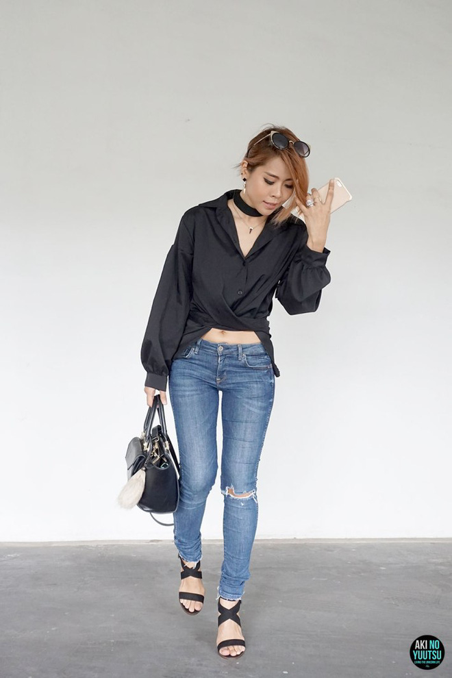 Ngược lại, nếu bạn là một cô nàng hiện đại, năng động thì có thể mix sơmi tối màu cùng với quần/váy jeans và giày sneaker. Bộ đôi này chưa bao giờ là cũ trong việc làm tăng nét trẻ trung cho set đồ. Bạn chỉ cần lưu ý chọn những mẫu quần hoặc váy có thêm chi tiết cách điệu như rách gấu, xẻ gấu, quần lửng để set đồ không bị nhàm chán.