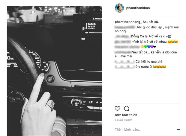 Trên trang Instagram, siêu mẫu Thanh Hằng vừa chia sẻ tấm hình đen trắng đầy tâm trạng. Kèm theo đó là dòng đề "Sau tất cả", được biết đây là ca khúc mà chân dài 1m12 cực kỳ yêu thích. Điều đáng nói, người hâm mộ tinh ý nhận ra siêu mẫu đang đeo trên tay chiếc nhẫn kim cương lấp lánh trên tay. Theo một nguồn tin cho biết, chiếc nhẫn mà cô đeo có kích cỡ rơi vào khoảng 7-8 li, ước tính có giá trị lên tới gần 1 tỷ đồng.