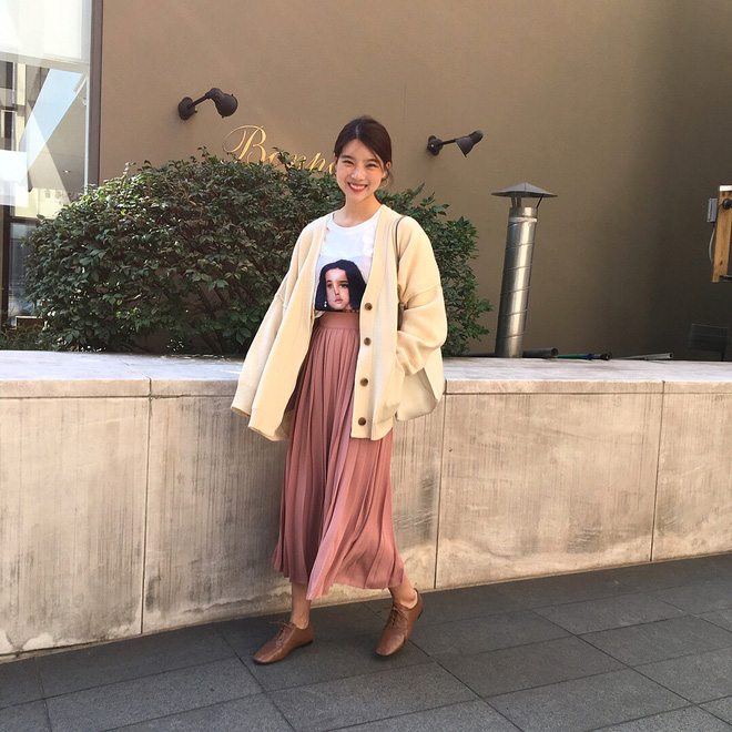 Để tận dụng set áo phông, chân váy midi, bạn chỉ cần mix cùng 1 chiếc cardigan oversize là đủ.