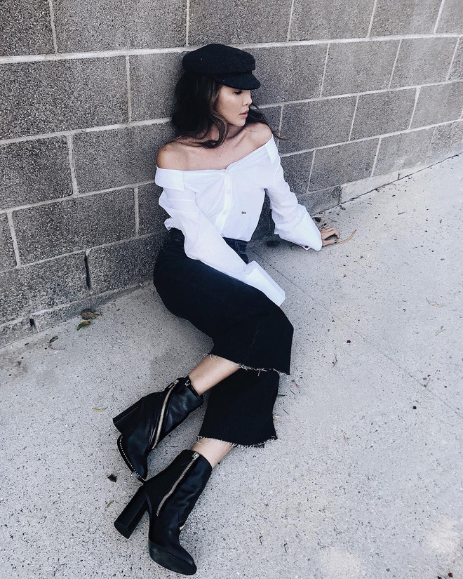 Không quá hở hang nhưng vẫn đủ thú vị và sexy chính là set áo trễ vai, quần jeans, boot cao cô và mũ beret của Chriselle Lim.