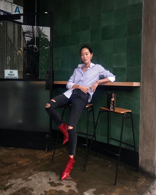Áo sơmi, quần skinny rách đã không còn nhàm chán do Aimee Song đã chọn đôi boot đỏ làm bạn đồng hành.