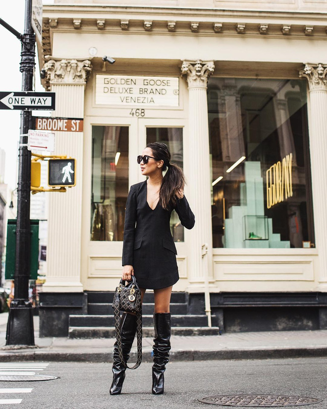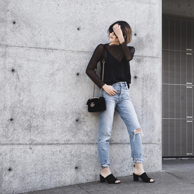 All Black chưa bao giờ là cách set đồ lỗi mốt, khi không biết mặc gì, bạn cứ diện nguyên cả cây đen, chọn thêm phụ kiện ánh kim là đủ nổi bật.