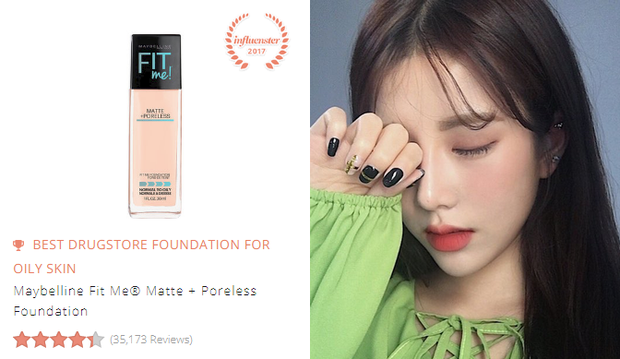 Kem nền Maybelline Fit Me Matte + Poreless Foundation (185.000 VNĐ): Cung cấp lớp nền mịn ráo, lì nhưng không khô mốc, trông tựa như làn da thật, kem nền Fit Me của Maybelline đạt hơn 4 sao trên tổng số 35.000 review.