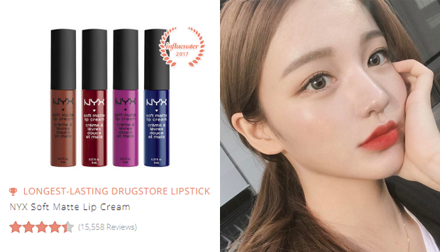 Son kem NYX Soft Matte Lip Cream (150.000 VNĐ): Là dòng son kem đầu tiên ra mắt trên thị trường, son kem Soft Matte của NYX vẫn giữ vững được vị thế của mình với hơn 4 sao trên tổng số 15.500 review. Hiện dòng son nổi tiếng này có tổng cộng 34 màu.