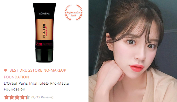 Kem nền L'Oreal Paris Infallible Pro-Matte Foundation (300.000 VNĐ): Cho lớp nền mịn mượt với độ che phủ khá, nhẹ mặt và đặc biệt lâu trôi, kem nền Infallible Pro-Matte được đánh giá hơn 4 sao trên tổng số 9.700 review.