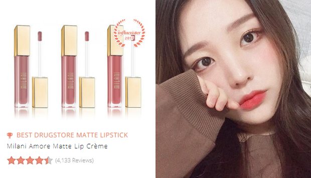 Son kem lì Milani Amore Matte Lip Creme (140.000 VNĐ): Vượt qua hàng loạt đối thủ, son kem lì của nhà Milani trở thành cây son kem bình dân được yêu thích nhất với 4,5 sao trên tổng số 4.100 review. Dòng son này hiện có bảng màu khá đồ sộ với tận 35 lựa chọn màu khác nhau.