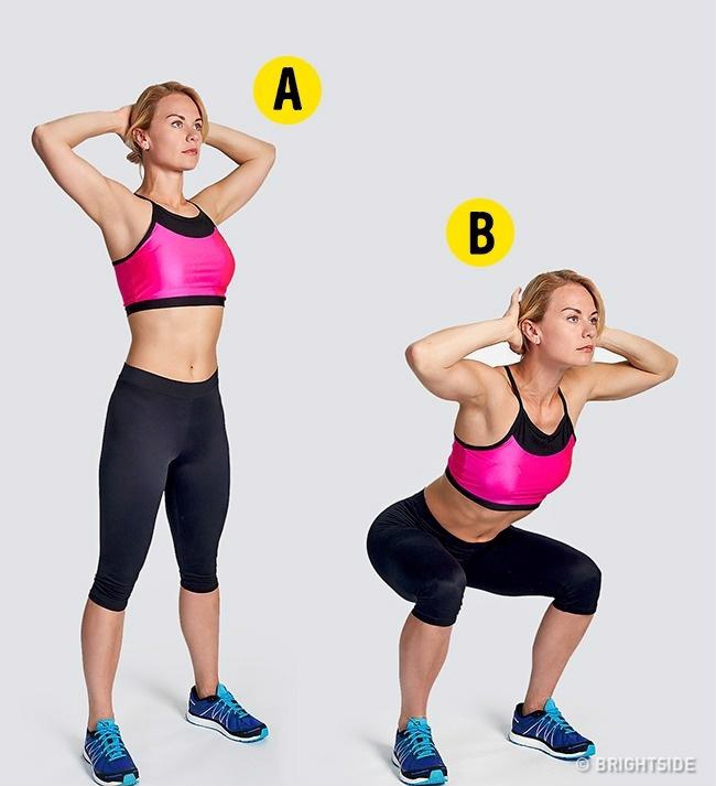 Hạ thân xuống càng thấp càng tốt, cố giữ thẳng lưng. Trở lại vị trí ban đầu, thực hiện bài tập này trong vòng 1 phút. Bài tập giúp căng cơ chân và mông.