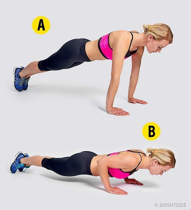 Bắt đầu ở tư thế plank (A) sao cho tay mở rộng bằng vai. Vai, đầu gối, mông, lưng và bàn chân cùng nằm trên một đường thẳng. Từ từ hạ thấp cơ thể bằng cách dùng lực ở tay, cố gắng giữ khuỷu tay song song với cơ thể. Lặp lại vị trí ban đầu.