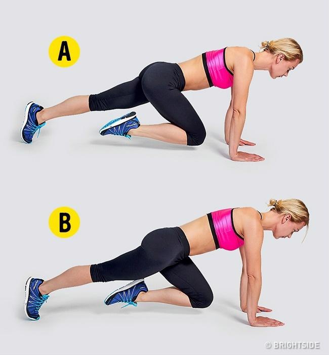 Bài tập phức tạp này giúp tăng cường cơ bắp và đốt cháy chất béo hiệu quả. Bắt đầu với tư thế plank như trên, co chân phải và kéo lên sát ngực, khi tập tư thế này phải cố định vị trí của lưng và hông. Trở lại vị trí ban đầu và đổi bên chân.
