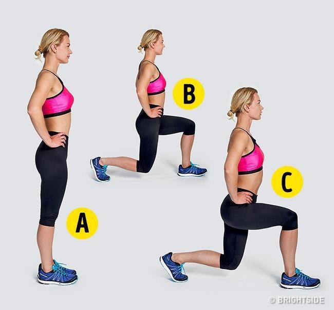 Bắt đầu bằng tư thế đứng thẳng, lưng, vai, hông trên một đường thẳng, tay chống nạnh. Bước chân trái lên phía trước, thực hiện động tác khuỵu chân xuống sao cho chân trái tạo thành một góc vuông, đùi trái song song với sàn nhà, đùi phải gần chạm sàn, giữ cố định thẳng vai, lưng và đầu cổ. Trở lại vị trí ban đầu và đổi chân.