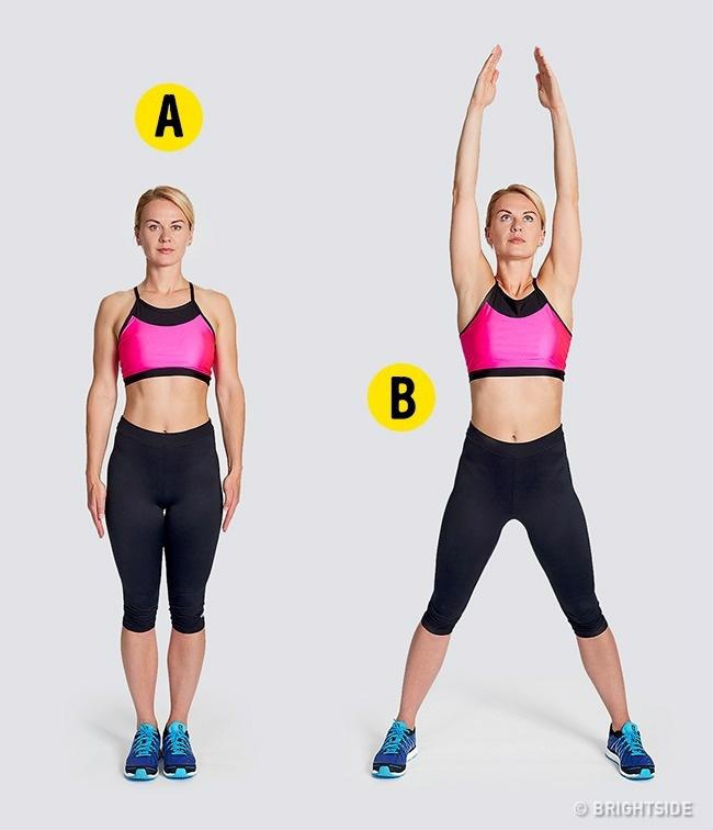 Bài tập thể dục có tên là Jumping Jacks là một phần trong chương trình huấn luyện quân sự ở Mỹ vì nó giúp cải thiện sức chịu đựng thể chất. Đứng thẳng ở vị trí ban đầu, 2 tay xuông theo thân. Thực hiện tư thế bằng cách dang rộng 2 chân sang 2 bên và nâng cánh tay qua đầu. Trở về vị trí ban đầu bằng động tác nhảy nhanh và lặp lại liên tục.