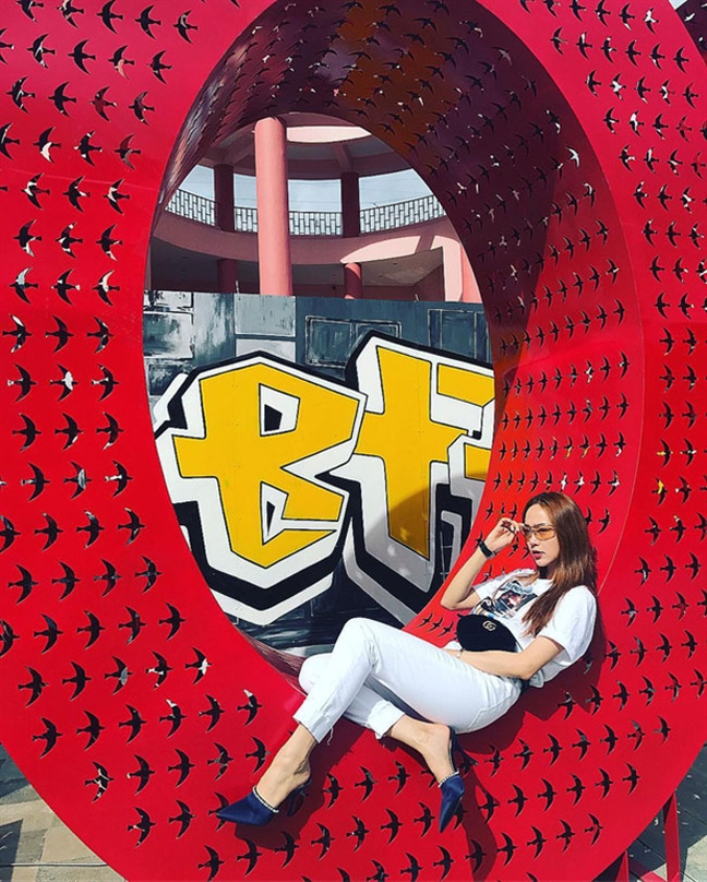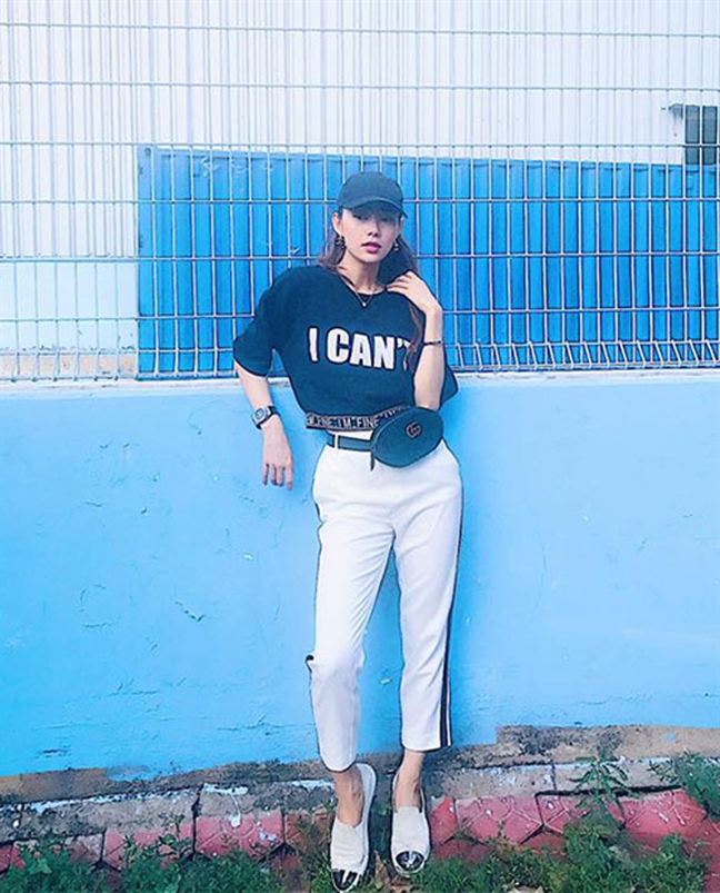 Nếu như set đồ ở trên cá tính, thời thượng thì đây lại là phong cách nữ tính nhẹ nhàng hơn của Minh Hằng khi kết hợp cùng túi đeo hông.
