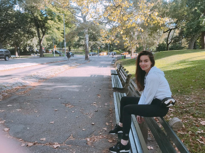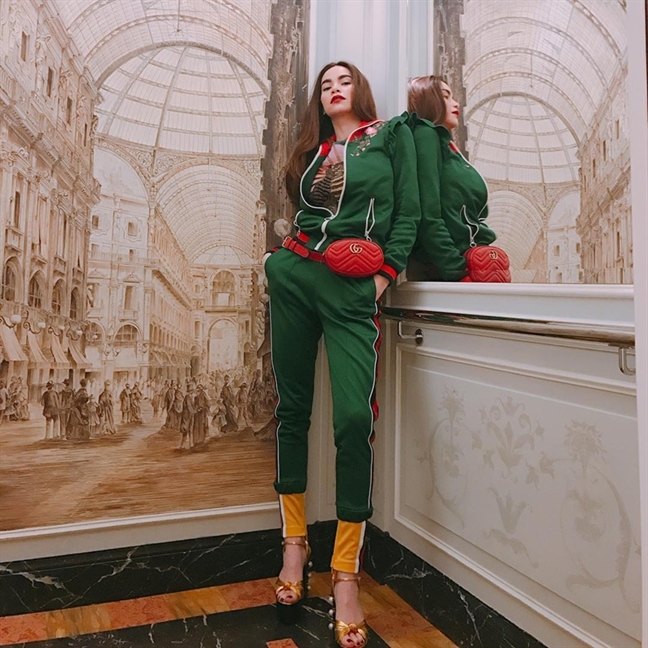 Vẫn là túi màu đỏ nổi bật, vẫn là cả cây đồ Gucci đắt giá nhưng lần này Hà Hồ chọn một set thể thao màu xanh đương nhiên có đường viền xuyệt tông màu với túi.