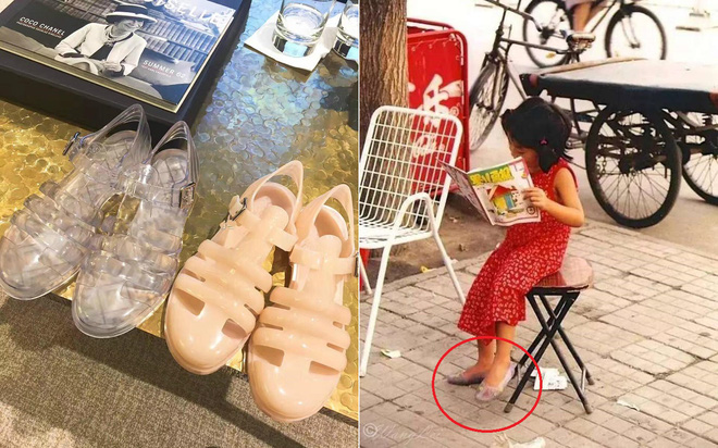 Chanel cũng từng khiến công chúng mắt tròn mắt dẹt khi cho trình làng mẫu giày nhựa có giá 14 triệu đồng (ảnh trái). Đôi giày này quả thật không khác gì với mẫu giày nhựa của các bé gái vẫn hay đi (ảnh phải).