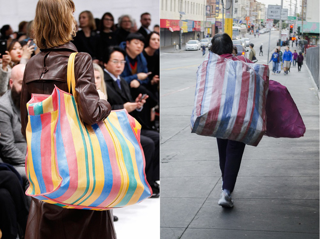 Rồi thì đến mẫu túi tote quê kiểng của Balenciagea (ảnh trái) trông chả khác nào mẫu túi nhựa thông thường (ảnh phải) người ta vẫn dùng để đựng đồ về quê đâu cơ chứ. Thế nhưng mẫu túi này cũng có giá ngót nghé 67 triệu đó nhé.