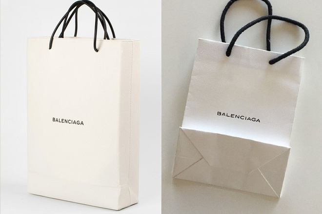 Balenciaga quả là thương hiệu rất biết cách khiến giới mộ điệu phải nhớ đến mình, khi hãng cho trình làng một mẫu túi mua hàng. Trong khi túi xịn (ảnh trái) có giá 25 triệu đồng thì túi giấy (ảnh phải) lại là túi được cho không khi mua hàng của hãng.