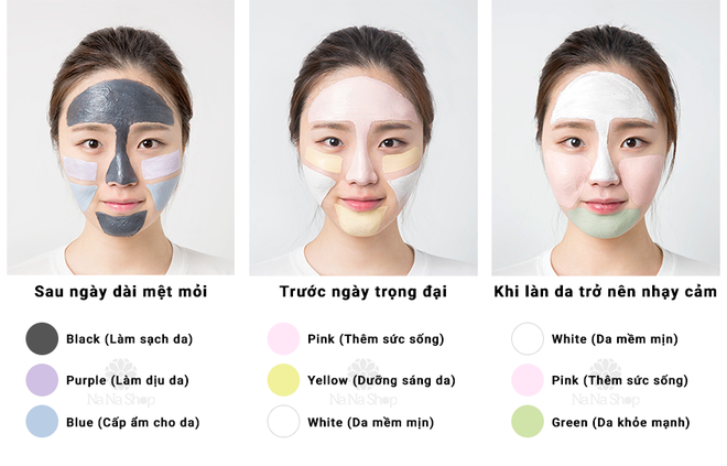 - Mặt nạ dạng kem (màu xanh lục và tím): có độ bám cao nên mất khá nhiều thời gian để có thể dàn đều mặt nạ ra toàn bộ khuôn mặt. Mặt nạ dạng kem sẽ giúp làm giảm kích ứng, đồng thời tạo nên một lớp màng để bảo vệ làn da một cách hiệu quả hơn.